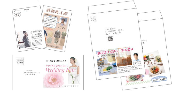 お一人お一人の異なる情報(氏名、住所、本文、写真、ナンバーリング、バーコードなど)の組み替え印刷が可能なので、DMハガキや案内状などの販促効果が期待できます。